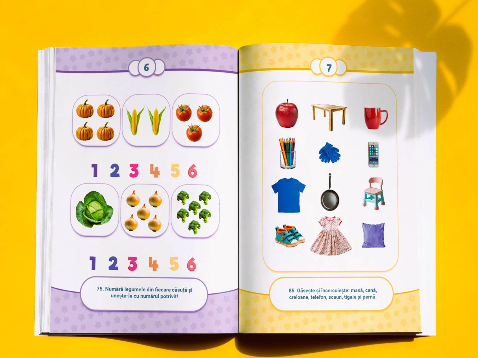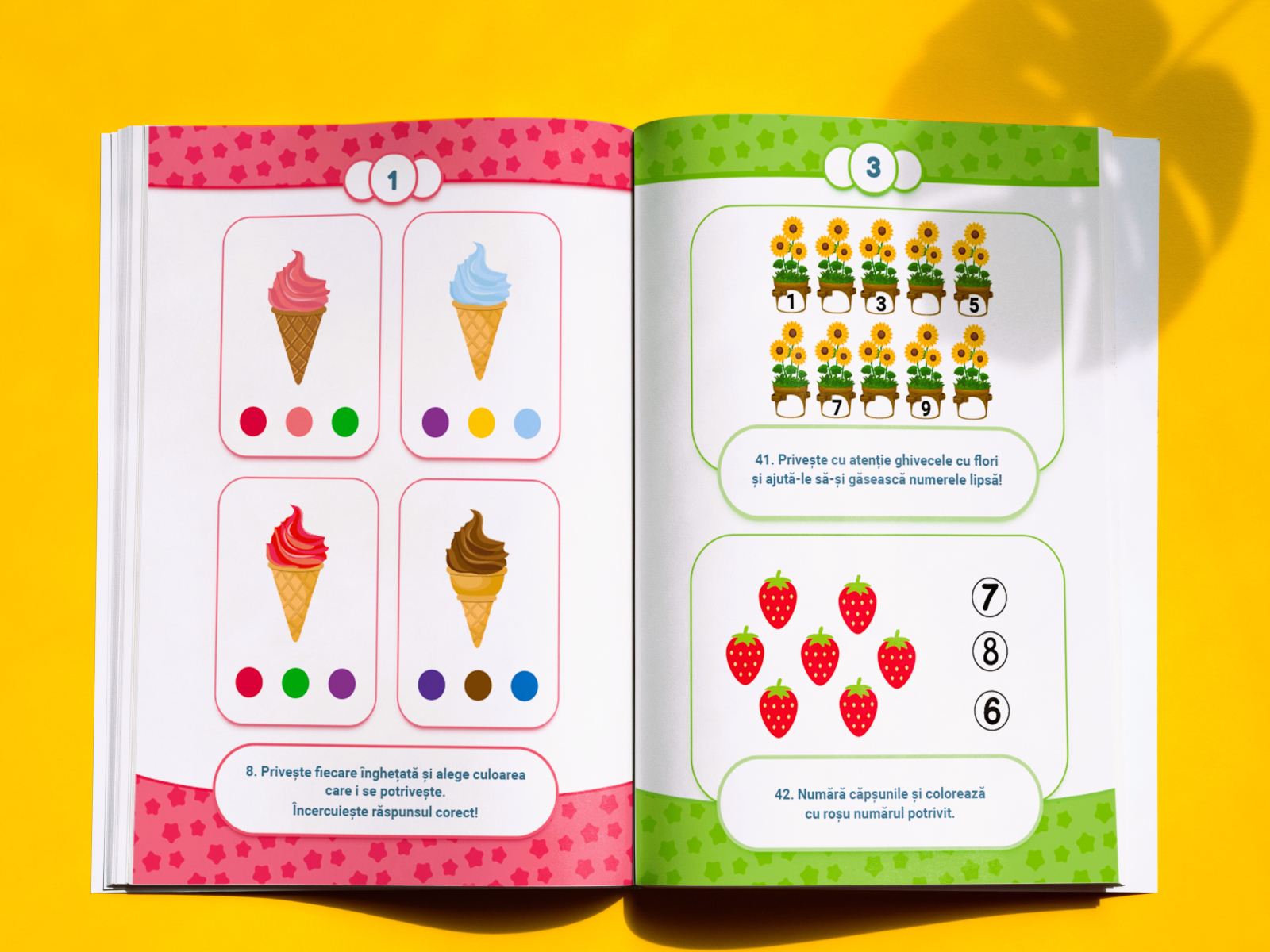 Caietul conține 90 de activități vizuale colorate, structurate pe teme familiare: culori, forme, numere, animale, fructe, legume și obiecte din viața de zi cu zi. Activitățile stimulează atenția, concentrarea, memoria, limbajul și motricitatea fină, ajutând copilul să învețe într-un mod vizual, calm și plăcut.